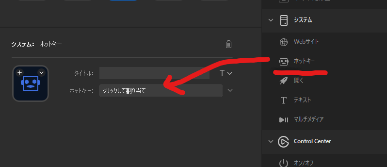 Stream deckの今後のアップデートで改善される可能性がありますが、キー割当をするにはStream deckのアプリからシステム>ホットキーを選んで割り当てます。