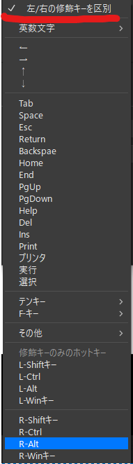 5. この状態でStream deckで右Altを押す動作を登録します。「左/右の修飾キーを区別」にチェックを入れないと区別してくれないのでチェックします。